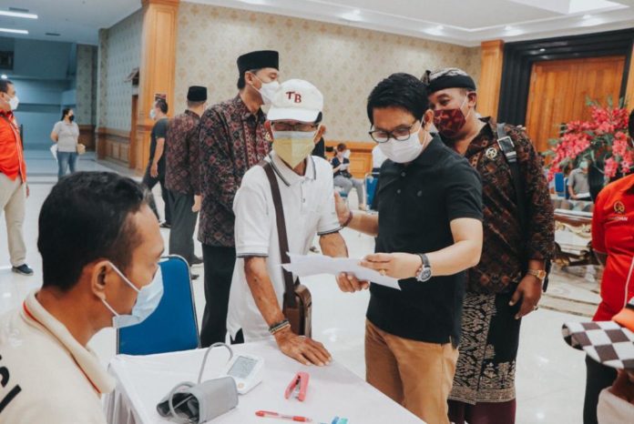 MANGUPURA, Fajarbadung.com – Sekretaris Daerah Kabupaten Badung sekaligus Ketua Forum Kerukunan Umat Beragama (FKUB) I Wayan Adi Arnawa meninjau pelaksanaan Vaksinasi Booster yang diselenggarakan oleh Polres Badung, di Gedung Balai Budaya Giri Nata Mandala Puspem Badung, Sabtu (5/3). Target vaksin dosis 3 untuk 700 peserta ini untuk pemuka agama, anggota FKUB Badung dan masyarakat umum. Turut hadir Kapolres Badung AKBP Leo Dedy Defretes, Wakil Ketua FKUB Badung Jonathan Suharto, Perwakilan PHDI Badung, beserta Perwakilan MUI.
