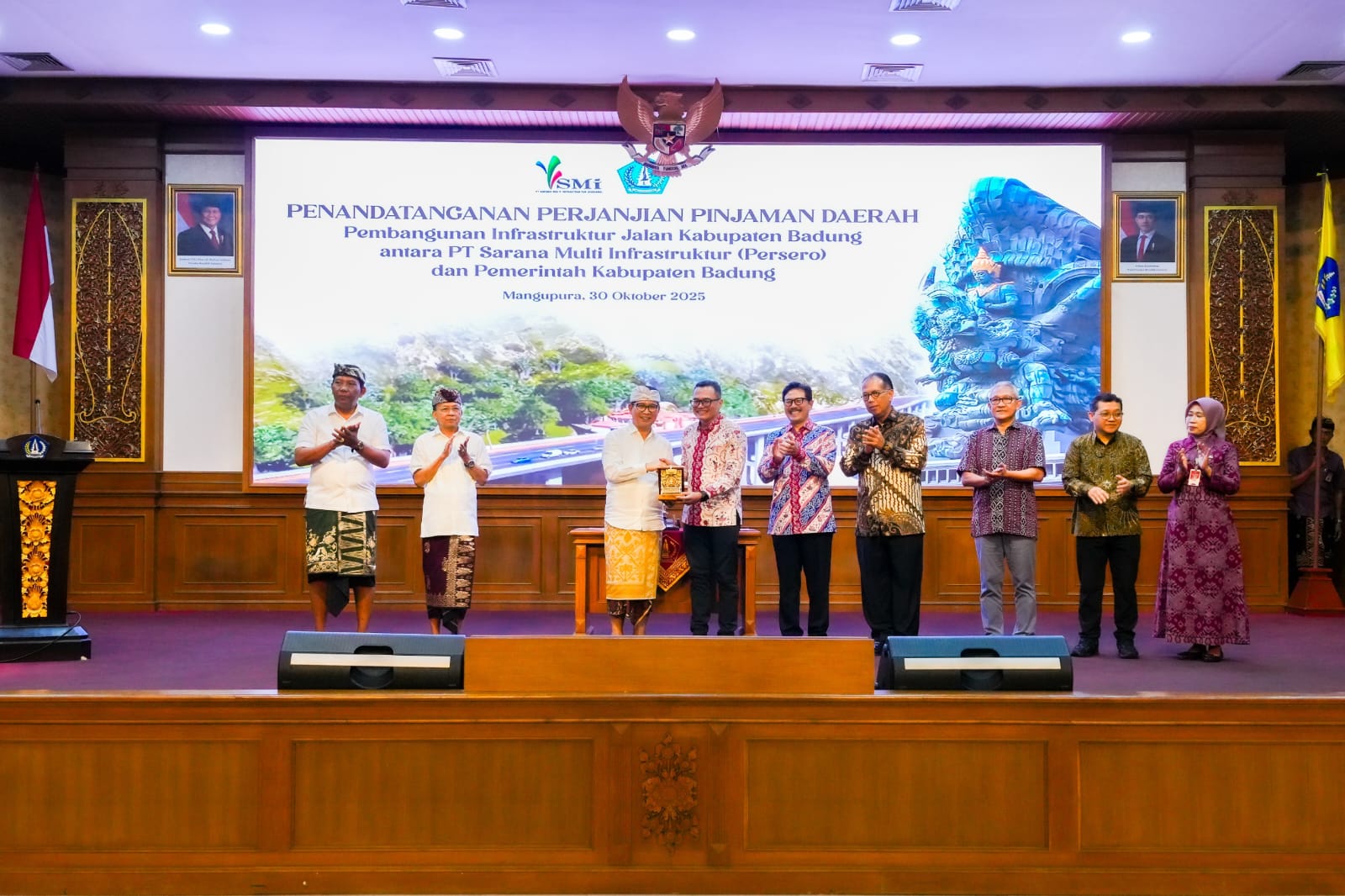 MANGUPURA, Fajarbadung.com – Untuk akselerasi pembangunan infrastruktur jalan guna mengurai kemacetan di kawasan Kuta Selatan dan Kuta Utara, Bupati Badung I Wayan Adi Arnawa didampingi Ketua DPRD Badung I Gusti Anom Gumanti menandatangani Perjanjian Pinjaman Daerah Pembangunan Infrastruktur Jalan Kabupaten Badung antara PT. Sarana Multi Infrastruktur (SMI) (Persero) dengan Pemkab Badung, bertempat di Ruang Kertha Gosana, Puspem Badung, Kamis, (30/10).