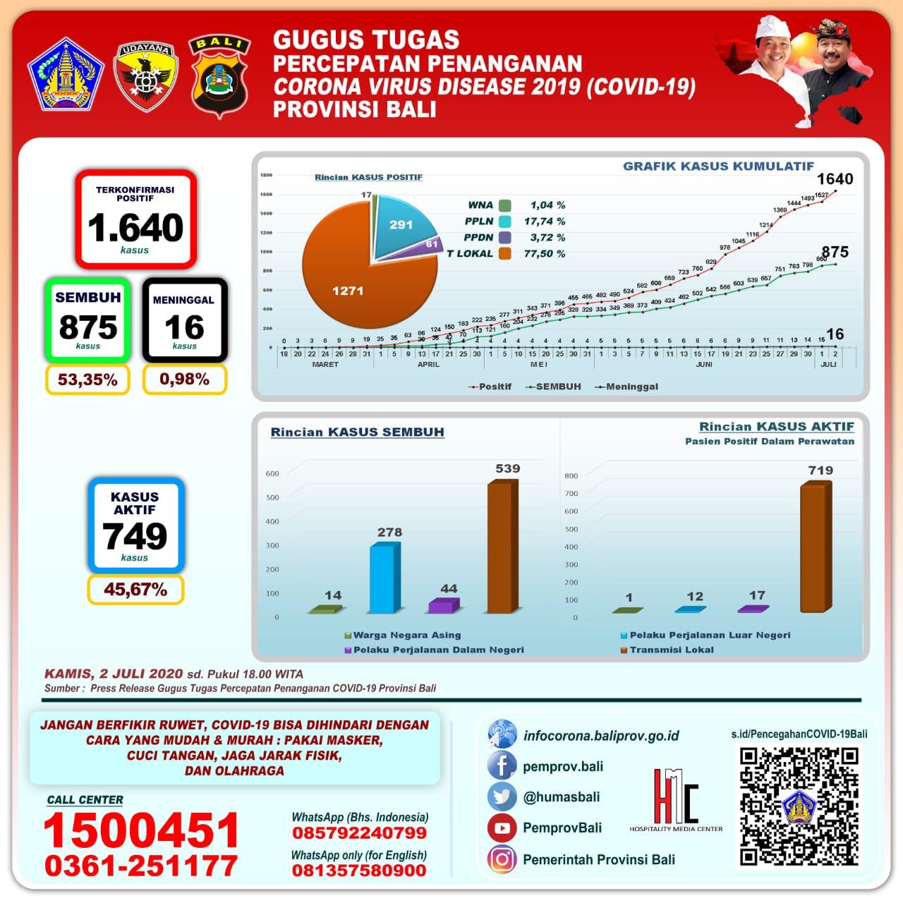 DENPASAR, Fajarbadung.com – Pemerintah Provinsi Bali, melalui Gugus Tugas Percepatan Penanganan COVID-19, menyampaikan perkembangan Penanganan Corona Virus Disease (COVID-19) di Provinsi Bali. Jumlah kumulatif pasien positif 1.640 orang (bertambah 113 orang WNI, terdiri dari 5 orang Imported Case (Indonesia) dan 108 orang Transmisi Lokal. Jumlah pasien yang telah sembuh 875 orang (bertambah 15 orang WNI, terdiri dari 15 orang Transmisi lokal). Jumlah pasien yang meninggal sejumlah 16 orang (bertambah 1 orang WNI, dengan rincian 1 orang transmisi lokal). Jumlah pasien positif dalam perawatan (kasus aktif) 749 orang yang berada di 14 rumah sakit, dan dikarantina di Bapelkesmas, UPT Nyitdah, Wisma Bima, Hotel Ibis, Hotel Gran Mega dan BPK Pering.