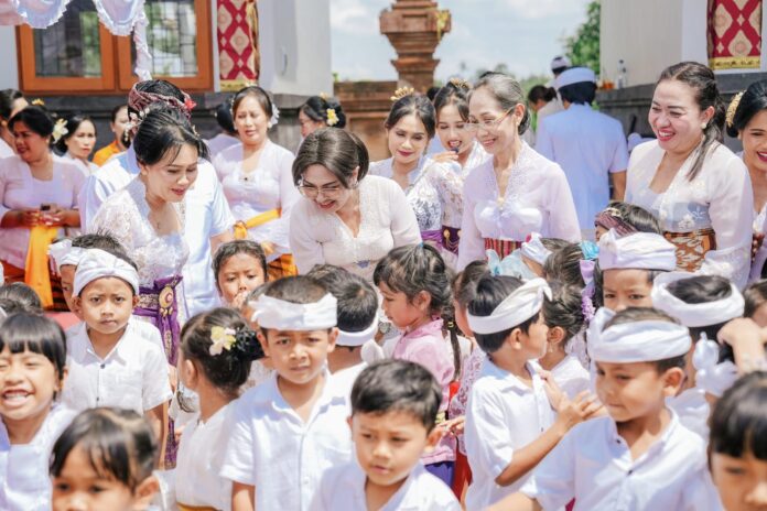 MANGUPURA, Fajarbadung.com – Bunda PAUD Kabupaten Badung Nyonya Rasniathi Adi Arnawa menghadiri Karya Melaspas, Ngenteg Linggih sekaligus meresmikan Gedung baru TK. Kumara Ngurah Rai I yang ditandai dengan pemotongan pita, Kamis (16/4).