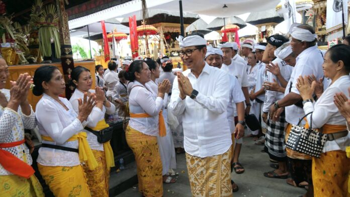 Foto : Bupati Adi Arnawa menghadiri karya Ngenteg Linggih, Nila Pati dan Padudusan Alit Wrespati Kalpa Madya, Pura Pasek Gelgel Tagtag, Seminyak, Kuta, Kamis (30/10).