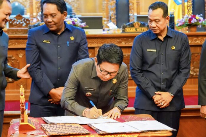 MANGUPURA, Fajarbadung.com – Bupati Badung I Wayan Adi Arnawa didampingi Wakil Bupati Badung Bagus Alit Sucipta menghadiri Rapat Paripurna dengan Agenda Pengambilan Keputusan terhadap Ranperda tentang RPJMD Semesta Berencana Kabupaten Badung Tahun 2025-2029, Ranperda tentang Perubahan atas Perda Badung No. 7 tahun 2023 tentang Pajak Daerah dan Retribusi Daerah dan Rancangan Perubahan KUA dan Perubahan PPAS Tahun Anggaran 2025 bertempat di Ruang Rapat Utama Gosana, Kantor DPRD Badung, Selasa (5/8).