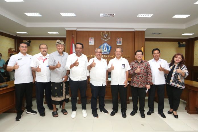 Caption : Ketua DPRD Badung Putu Parwata berfoto bersama dengan Direktur Pengelolaan Dukungan Pemerintah dan Pembiayaan Investasi Dirjen Pengelolaan Pembiayaan Risiko Kemenkeu Brahmantio Istiyoso, serta beberapa pejabat lain dari Dinas PUPR di Kantor DPRD Badung, Rabu (6/4/2022)..(tim)