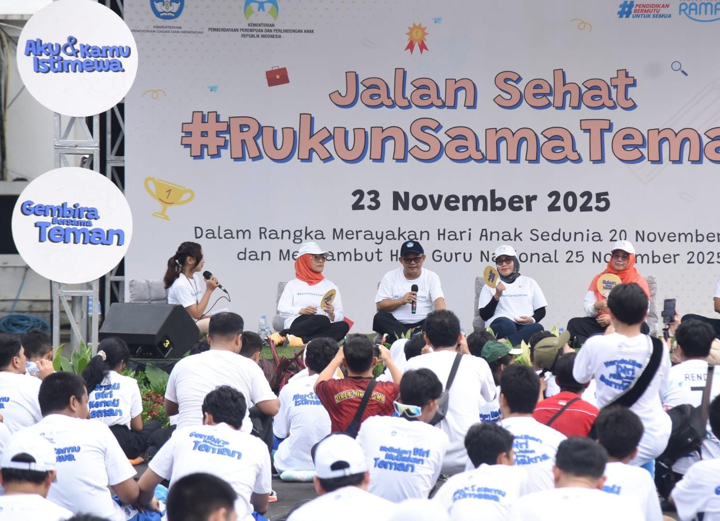 JAKARTA, Fajarbadung.com – Memperingati Hari Anak Sedunia dan menjelang Hari Guru Nasional, Kementerian Pendidikan Dasar dan Menengah (Kemendikdasmen) melalui Pusat Penguatan Karakter (Puspeka) berkolaborasi dengan Kementerian Pemberdayaan Perempuan dan Perlindungan Anak (Kemen PPPA) menyelenggarakan kegiatan Jalan Sehat bertajuk #RukunSamaTeman pada Minggu (23/11).