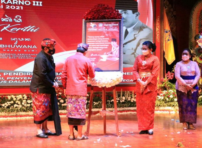 “Tanpa menggunakan teks, Bung Karno menguraikan lima hal yang menurutnya adalah landasan filosofis dasar dan cara pandang bagi negara Indonesia merdeka. Kelima hal yang menjadi landasan idiil Indonesia Merdeka tersebut kemudian diberi nama Pancasila. Sehingga saat itu, paparan Bung Karno diterima secara aklamasi dan pada 1 Juni 1945 itulah Pancasila Lahir,” demikian pidato yang disampaikan Gubernur Bali, Wayan Koster saat membuka peringatan Bulan Bung Karno III Provinsi Bali, Selasa (Saniscara Paing, Langkir) tanggal 1 Juni 2021 di Gedung Ksirarnawa, Taman Budaya, Denpasar.