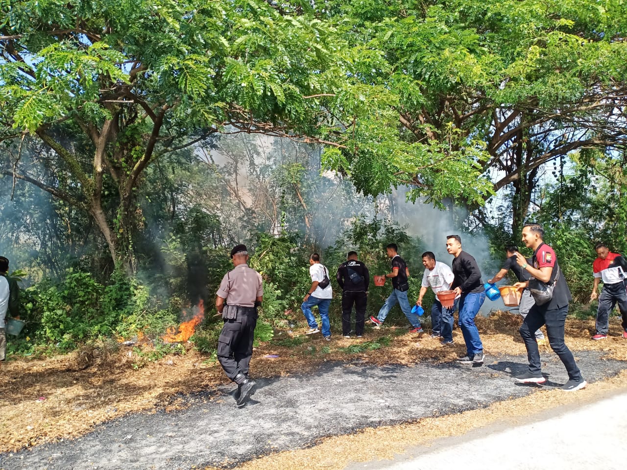 Masyarakat seputaran Puncak Mangu Belok Sidak, Petang, Badung melakukan pemadaman seadanya dengan peralatan yang sangat minim, sehingga api semakin menguasai, membakar habis di sekitar hutan samping Pura Puncak Mangu.