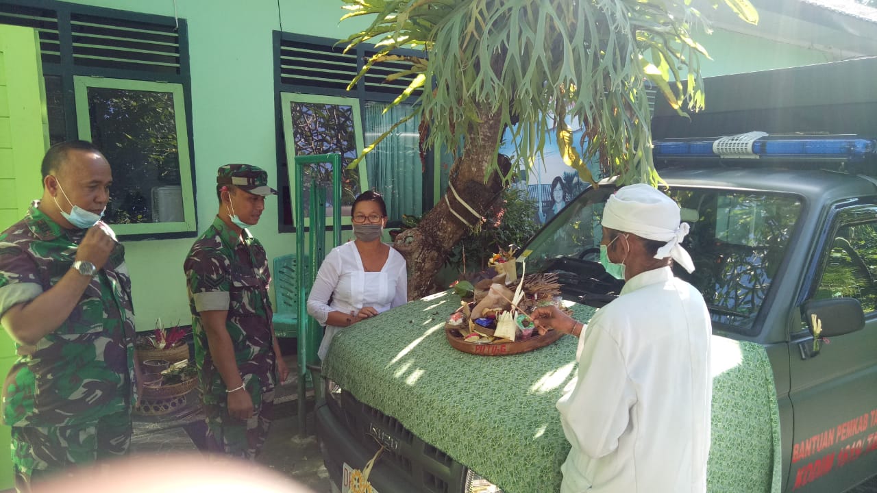 TABANAN, Fajarbadung.com – Kodim 1619/Tabanan melalsanakan upacara secara Agama Hindu yaitu melaspas mobil baru yang diterima dalam bentuk bantuan hibah dari Pemerintah Kabupaten Tabanan yang sekaligus juga melaksanakan upacara bagi renovasi bangunan di Makodim, Senin (30/03/2020)