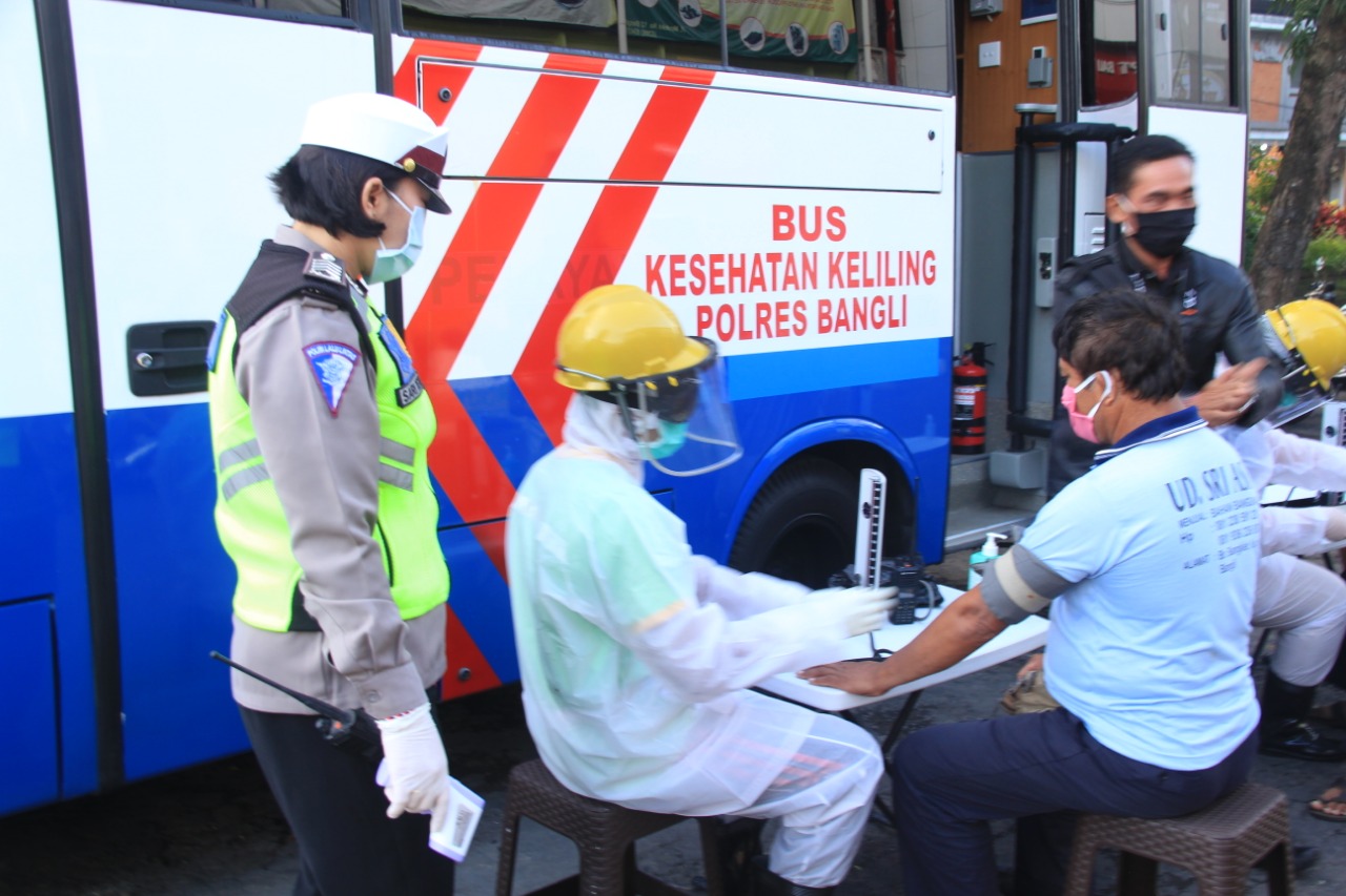 BANGLI, Fajarbadung.com – Dalam mencegah penyebaran pandemi Corona Virus Disease (Covid-19) Satuan Lalu Lintas (Satlantas) Polres Bangli melakukan inovasi baru. Yakni menjadikan mobil layanan SIM Keliling sebagai kendaraan layanan kesehatan bagi masyarakat Bangli, di depan Pasar Kidul, Jalan Merdeka, Selasa (14/4). Selain cek kesehatan, baik pedagang, pengunjung maupun masyarakat sekitar termasuk pengguna jalan yang melintas di kawasan tersebut, petugas juga membagikan masker.