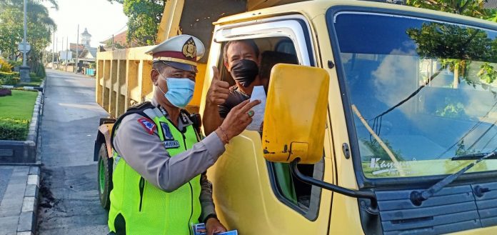 MENGWI, Fajarbadung.com – Satuan Lalu Lintas Polres Badung terus mengingatkan pengendara kendaraan untuk hati-hati di jalan, sambil membagikan lembar himbauan, untuk mematuhi peraturan lalu lintas dan mentaati Protokol kesehatan. Sabtu, (7/11/2020).