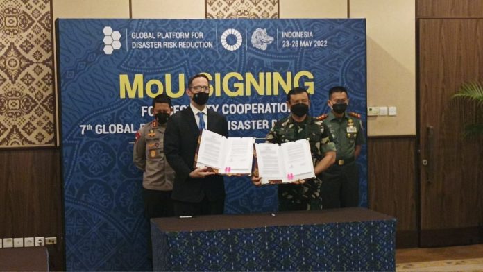 NUSA DUA, Fajarbadung.com – Pemerintah Indonesia dan Perserikatan Bangsa-Bangsa (PBB) menandatangani perjanjian bidang kerja sama pengamanan jelang Global Platform for Disaster Risk Reduction (GPDRR) ke-7. Penandatanganan nota kesepahaman antara dua pihak ini diselenggarakan di Nusa Dua, Provinsi Bali, pada Rabu (27/4/2022). Nota Kesepahaman tersebut memfokuskan pada kerja sama pengamanan yang nantinya mengatur peran TNI, Polri dan PBB, dalam hal ini United Nations Department for Safety and Security (UNDSS).
