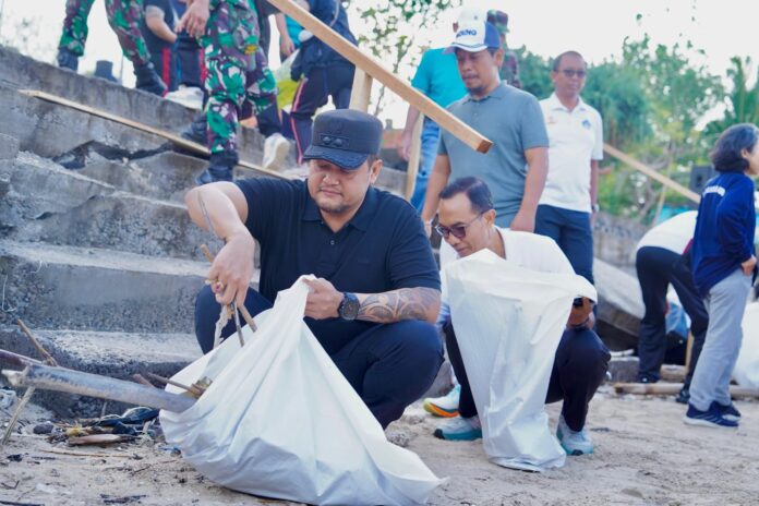 FOTO : Wabup Bagus Alit Sucipta saat hadir di World Water Day 2026 aksi bersih-bersih pantai di kawasan Pantai Kelan, Kuta, Badung, Jumat (27/3).