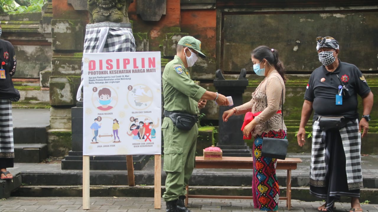 Hal ini dapat dilihat ketika hendak memasuki areal pura. Dimana, saat memasuki areal Pura di pintu masuk, beberapa orang petugas dari Linmas dan pecalang Kelurahan Dangin Puri melakukan penjagaan. Para pemedek yang datang diarahkan untuk mencuci tangan, diberikan hand sanitizer, melakukan pengecekan suhu tubuh dan diwajibkan menggunakan masker dengan baik.