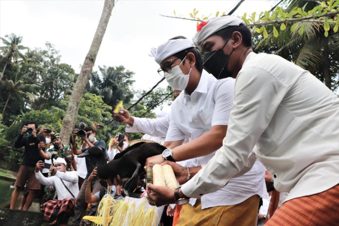 SANGEH, FAJARBADUNG.COM – Bertepatan dengan Tumpek Uye, Sabtu (29/1) dilaksanakan upacara Danu Kerthi yang dipuput oleh Ida Pedanda Gede Pasuruan Manuaba dari Griya Megelung Sangeh, bertempat di Mata Air Taman Mumbul, Desa Adat Sangeh Kecamatan Abiansemal. Acara ini turut dihadiri Sekretaris Daerah (Sekda) Kabupaten Badung I Wayan Adi Arnawa beserta Nyonya Rasniathi Adi Arnawa, Kadis Kebudayaan I Gede Eka Sudarwitha, Kadis Perikanan Nyoman Suardana, Forkopimda Badung, OPD di Lingkungan Pemkab Badung, Majelis Desa Adat (MDA) Badung AA Putu Sutarja, Ketua Harian PHDI Badung Gede Rudia Adiputra, Camat Abiansemal Ida Bagus Putu Mas Arimbawa, Perbekel Sangeh I Made Werdiana, Bendesa Adat Sangeh IGA Adi Wiraputra, para yowana dan masyarakat setempat.
