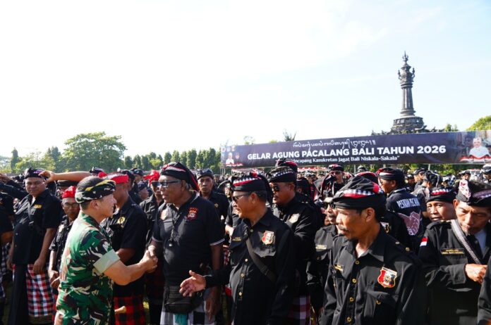 DENPASAR, Fajarbadung.com – Pangdam IX/Udayana Mayjen TNI Piek Budyakto menghadiri Gelar Agung (Apel Besar) Pecalang Bali Tahun 2026 yang digelar di Lapangan Puputan Margarana (Niti Mandala), Renon, Denpasar Timur, Sabtu (7/3/2026). Kegiatan yang diikuti ribuan Pecalang dari seluruh Bali ini menjadi simbol kuat sinergi antara aparat negara dengan kearifan lokal dalam menjaga keamanan dan ketertiban masyarakat.