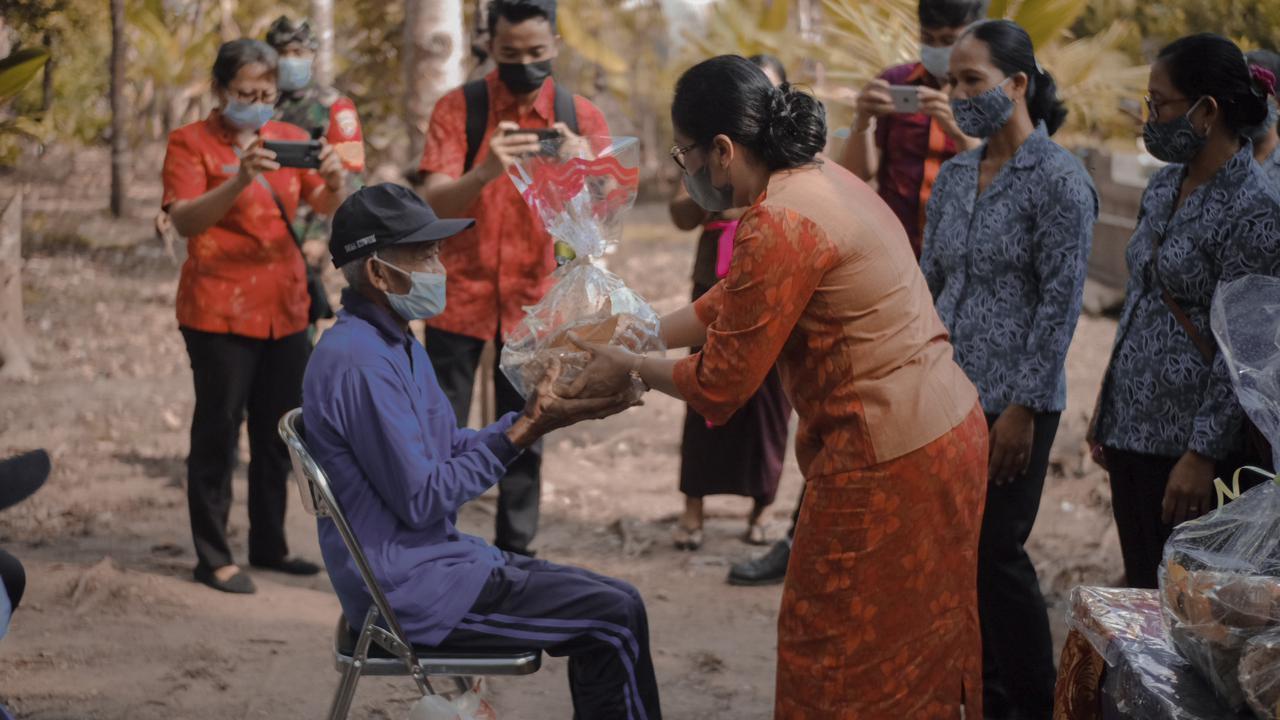 Selain meninjau perkembangan Hatinya PKK, Wakil Ketua TP. PKK Kabupaten Badung Ny. Kristiani Suiasa juga menyerahkan bantuan sembako dan masker kepada balita, lansia dan disabilitas yang berada di Desa Kuwum, Kecamatan Mengwi.