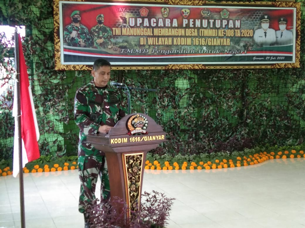 Penutupan TMMD Ke 108 Kodim 1616/Gianyar ditandai dengan pemukulan kulkul atau kentongan oleh Danrem 163/Wira Satya dan selanjutnya Danrem beserta rombongan meninggalkan Makodim 1616/Gianyar menuju lokasi TMMD Ke108 di Desa Buahan Kana untuk melakukan peninjauan bersama Pangdam IX/Udayana yang langsung berangkat dari Denpasar menuju lokasi TMMD.