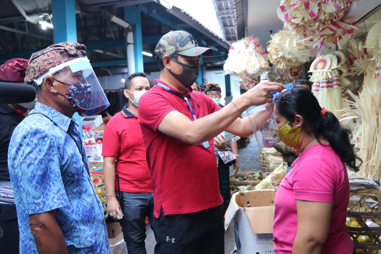 Berjualan di pasar dan memiliki intensitas tinggi berinteraksi dengan banyak orang tentu mengharuskan pedagang pasar dibekali dengan APD yang memadai. Kondisi tersebut menjadi perhatian Wakil Bupati Badung I Ketut Suiasa dengan membagikan face shield kepada para pedagang di Pasar Tradisional Desa Adat Sempidi-Kwanji, Sabtu pagi (18/7)