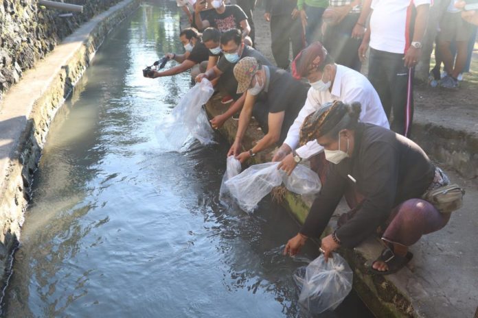 MENGWI, Fajarbadung.com – Sebagai upaya dalam melestarikan ekosistem perairan tawar sekaligus memperingati Bulan Bung Karno dan mendorong program Gerakan Memasyarakatkan Makan Ikan (Gemarikan), Wakil Bupati Badung I Ketut Suiasa melaksanakan penebaran 10.000 benih ikan nila di lingkungan Br. Tengah, Kaler dan Kelod Desa Gulingan, Kecamatan Mengwi, Sabtu (12/6/2021).